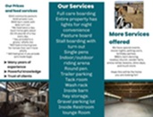 Facilities:  New metal horse-barn with 12' x 12' box stalls, outside runs, auto-waterers, outdoor arena and round pen. Lots of room for trailer parking and 3 electric pedestals for LQ trailers so you can stay with your horses. Bagged shavings are available. Reservations are appreciated but not required. Owner lives on site and we're open 24/7, so please call ahead if possible. Full services are available in Wellington.