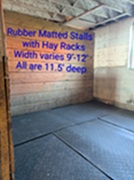 Facilities: 9 matted stalls ranging from 10' x 10' to 10' x 16'. Water, feed buckets, & bedding provided. Health certificates & proof of negative Coggins required. ALL DOGS MUST BE ON A LEASH. Drive through loading & unloading at barn doors for trucks with trailers up to 57' in total length. Larger trailers will need to drive in & back out. It is a straight shot on level ground from the road to the barns.